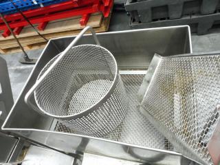 3 x Mobile stainless heated parts cleaner tanks been used for cleaning parts. Comes with some cleaning baskets . Single phase. Come on Steel Trolleys. Approx sizes-490mm x 350mm x 330mm.