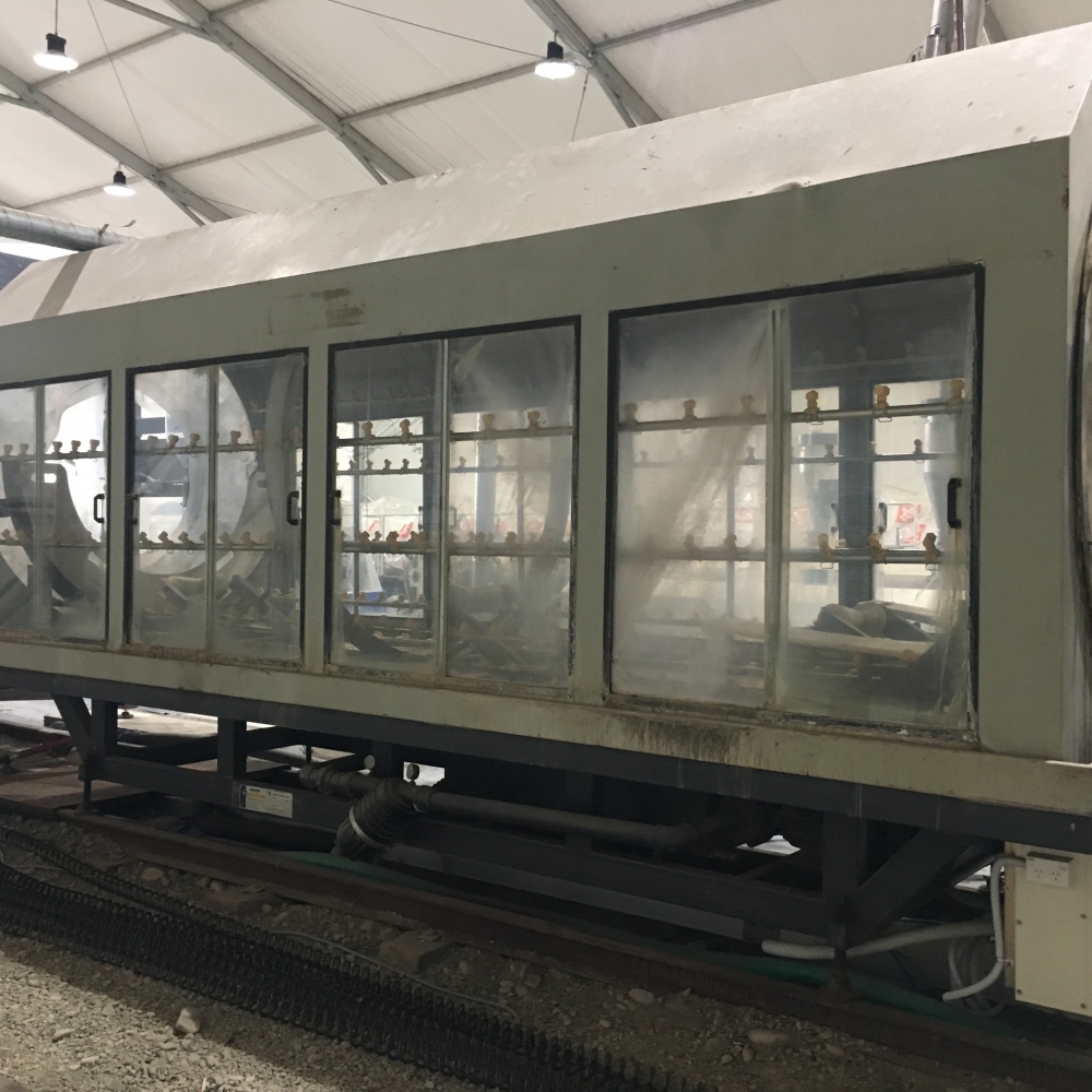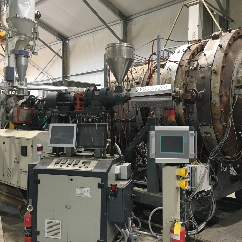 1600 LINE- EXTRUDER-2 X 150MM Extruders.Output per extruder,optimal 800 kg/ph(untested up to 1200kg/ph) 1 x 65mm extruder.Output 100/kg/ph. Comes with 2 x material hoppers-500 kg. Calibration Tanks-Vacuum Tank1(2 sections to enable dual vacuum control) includes Inoex ecco Ultrasonic measuring system to guide calibration. Vacuum tank 2..Quality Control-Inoex x Line Ultrasonic Measuring System and gravimetric system (Germany)This is linked to the extruders, haul off and material hoppers to allow full automation.Collects and monitors quality information. Spray Tank x 4 cools pipe to maintain pipe integrity and allow accurate measuring once cut. SICA Haul Off-P2000/14 plus (italy). Its Range is 630mm to 2000mm.It pulls the pipe at a constant speed during the extrusion process to maintain wall thickness. 1 x Planetary Saw(refurbished)..1 x Power Roller, assists with pulling the pipe once it has been cut..Material Dryer-(1x 2tn) 1x(3tn)