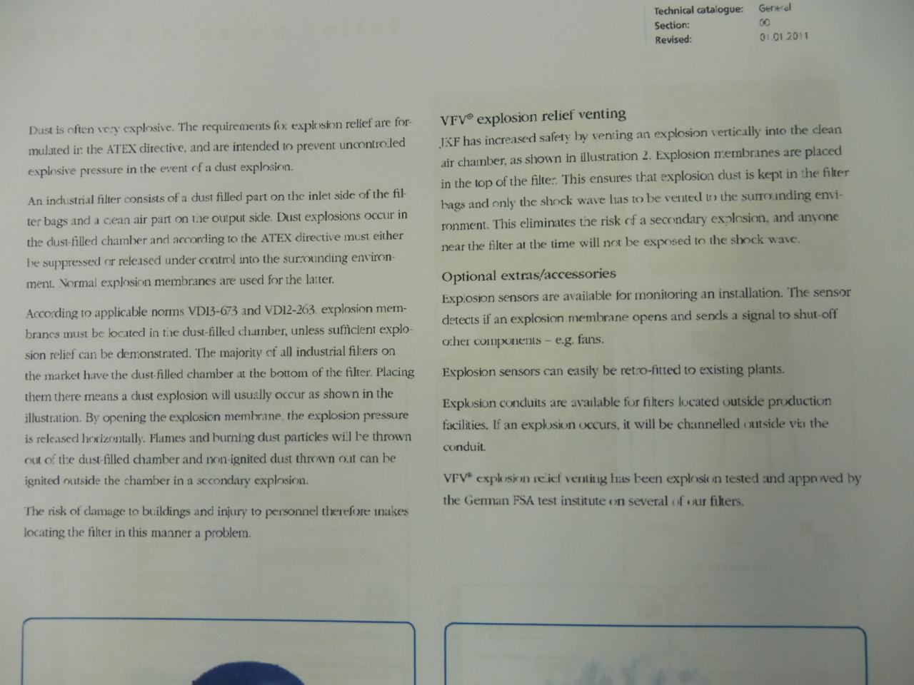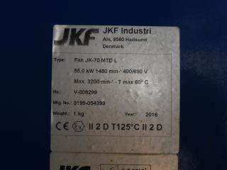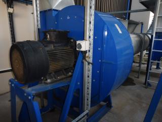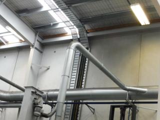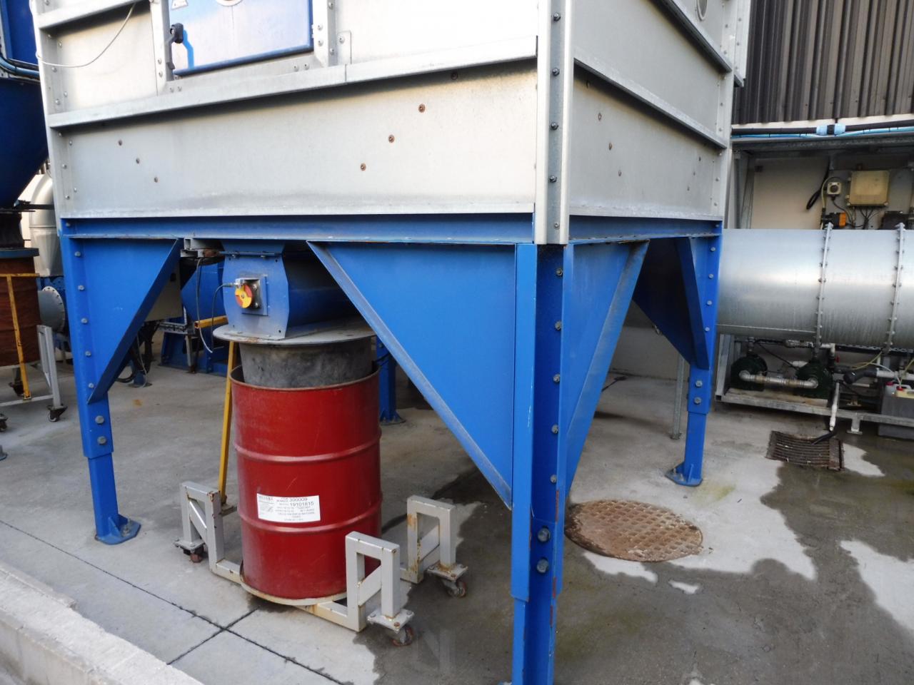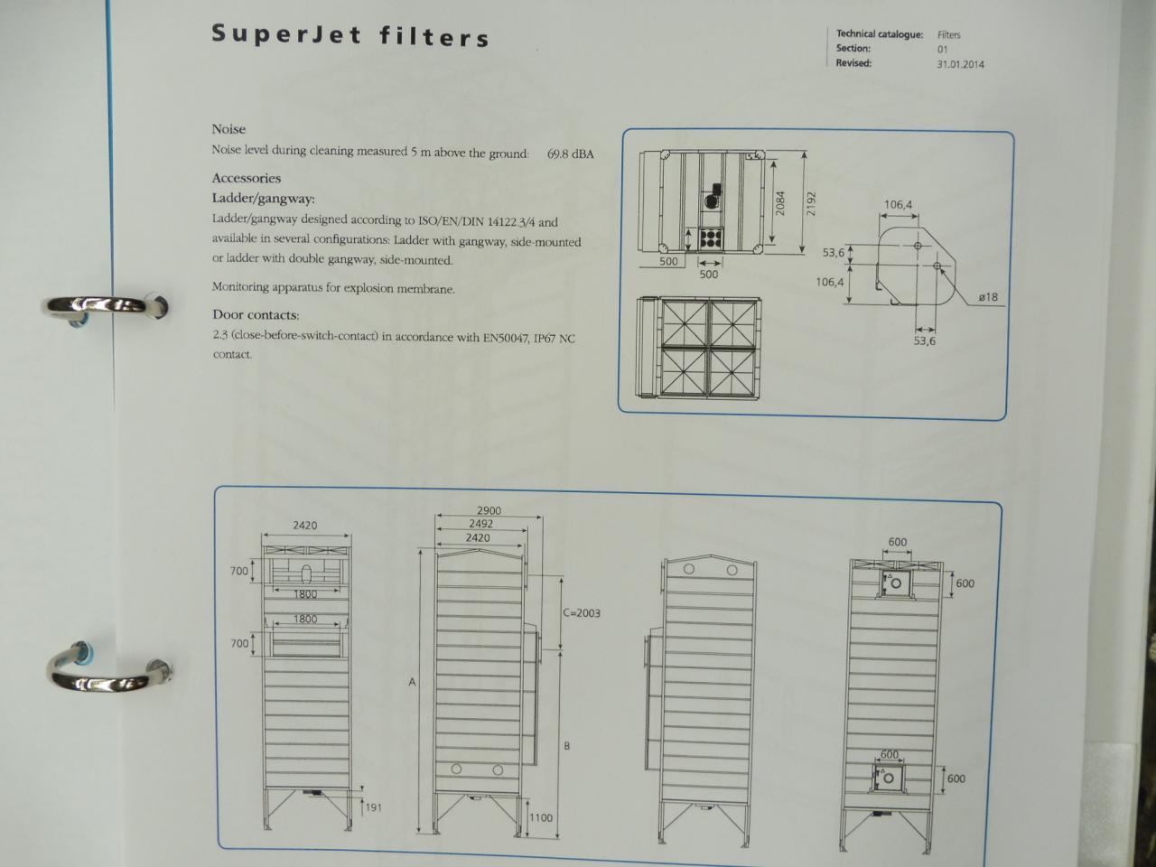 Specifications- Antistatic power pulse cleaning Dust Extraction System with explosion membrane and scrapper base-50 c/m cubed/1...Year 2016 ; includes Ladder with work Platform; External Ducting ; Internal Ducting 25 metres approx. Has a 10 metre stack. Complete with control panel ; JKF Fan, Type-JK70 MTDL ,55kw ,1480 min-1 ,400/690v ; JKF Rotary Valve ; Bag Length-5 metres ; Filter Area-269 m cubed; Weight approx-4110 kg ; Dimensions-9000 mm (h) x 2420mm x 2420mm . Please see photos for other Technical Information. A manual is available onsite to view.