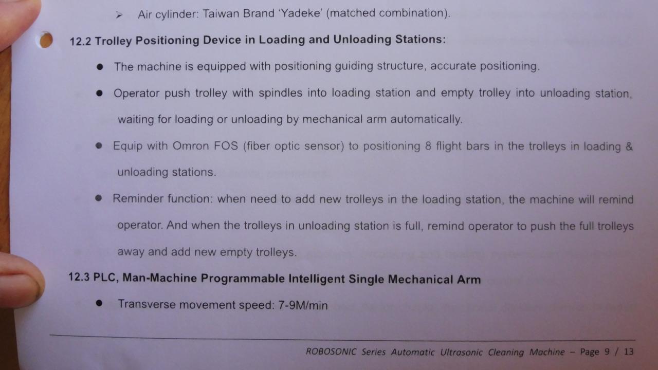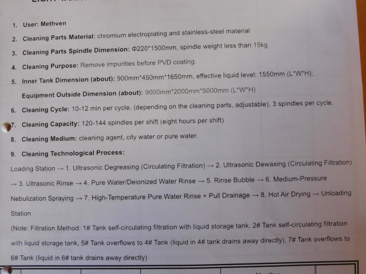 Full Automatic Ultrasonic Cleaning Machine with 8 tanks. Model ROBOSONIC-10800 - 8C; Year-2019/01/02. Designed by Keer Cleaning Equipment Co ltd.This equipment is a full automatic ultrasonic cleaning & drying line. This is a continuously working machine , controlled by PLC and human input to finish the ultrasonic degreasing ( circulation filtration ), ultrasonic dewaxing, ( circulation filtration ) ultrasonic rinse, pure water/deionized rinse, bubbling rinse, medium pressure nebulization spraying, high pressure water rinse with pull drainage, hot air drying and automatic temp control heating. Operator puts product into trolleys and places into loading station.The whole work process except pushing in/out is automatically completed by the machine. The cleaning part of the whole machine is a closed structure and the upper half of the outer cover is a window structure. It comes equipped with a circulating filtration system for the recycling of cleaning fluid. There is an independent electric control cabinet and all measuring instruments use metric units.