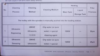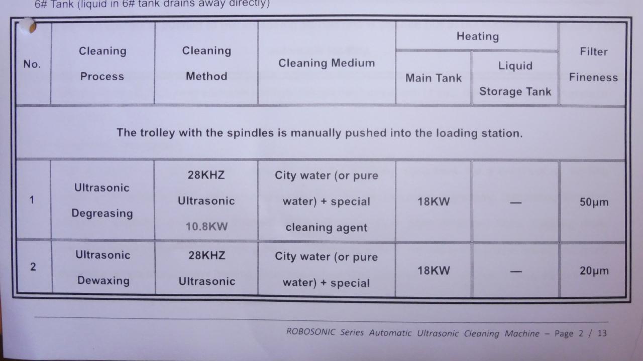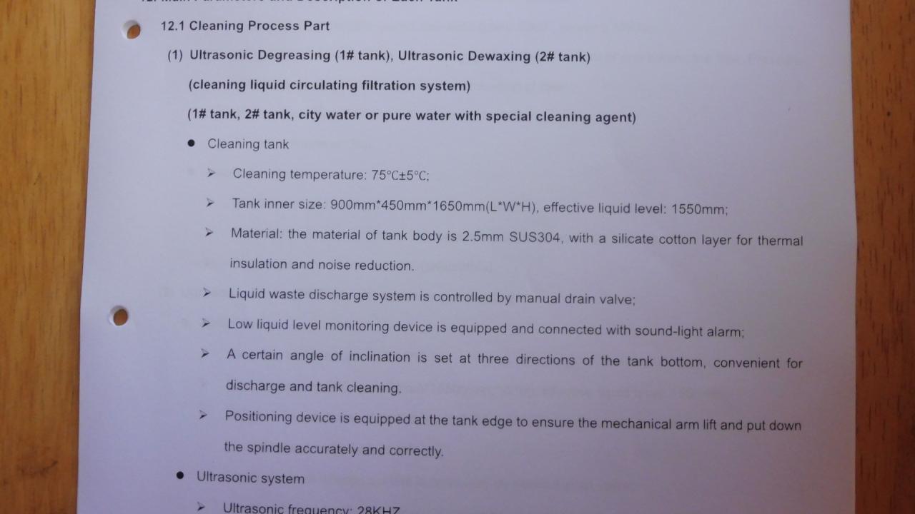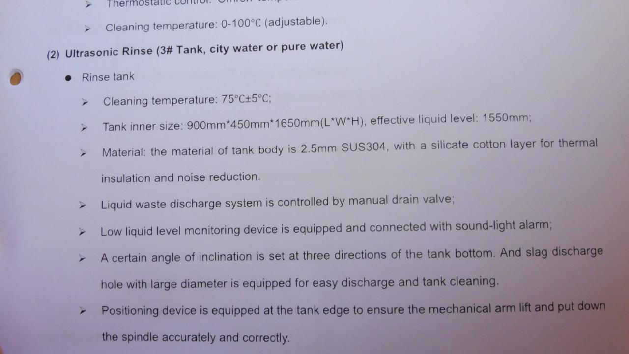 Ultrasonic Degreasing (tank 1), Ultrasonic Dewaxing (tank 2). Cleaning Temp-75 degrees, Tank inner size , 900mm x 450mm x 1650mm ,effective liquid level-1550mm. Material of tank body is 2.5mm SUS304, with a silicate cotton layer for thermal insulation and noise reduction. Liquid waste discharge system is controlled by manual drain valve.