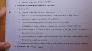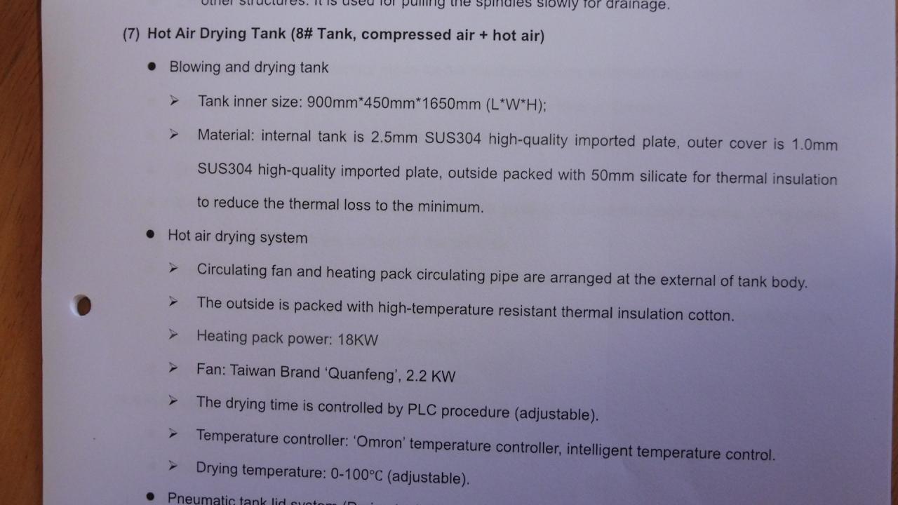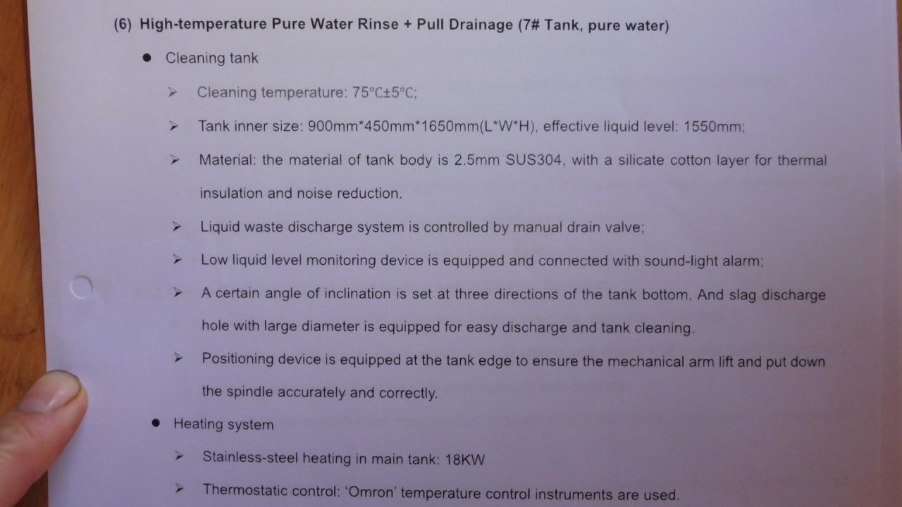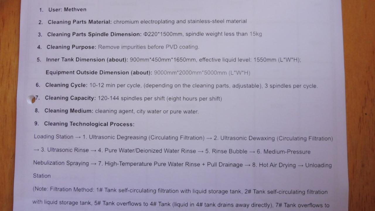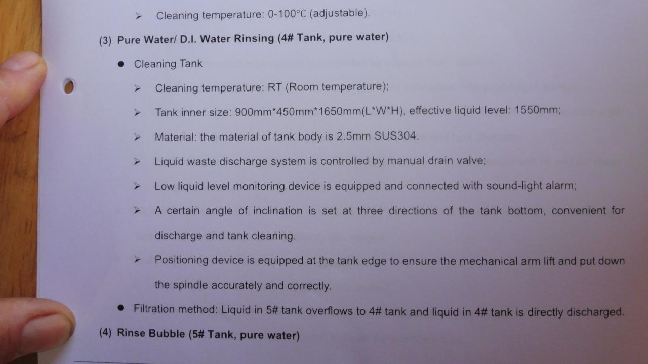 Ultrasonic Degreasing (tank 1), Ultrasonic Dewaxing (tank 2). Cleaning Temp-75 degrees, Tank inner size , 900mm x 450mm x 1650mm ,effective liquid level-1550mm. Material of tank body is 2.5mm SUS304, with a silicate cotton layer for thermal insulation and noise reduction. Liquid waste discharge system is controlled by manual drain valve.