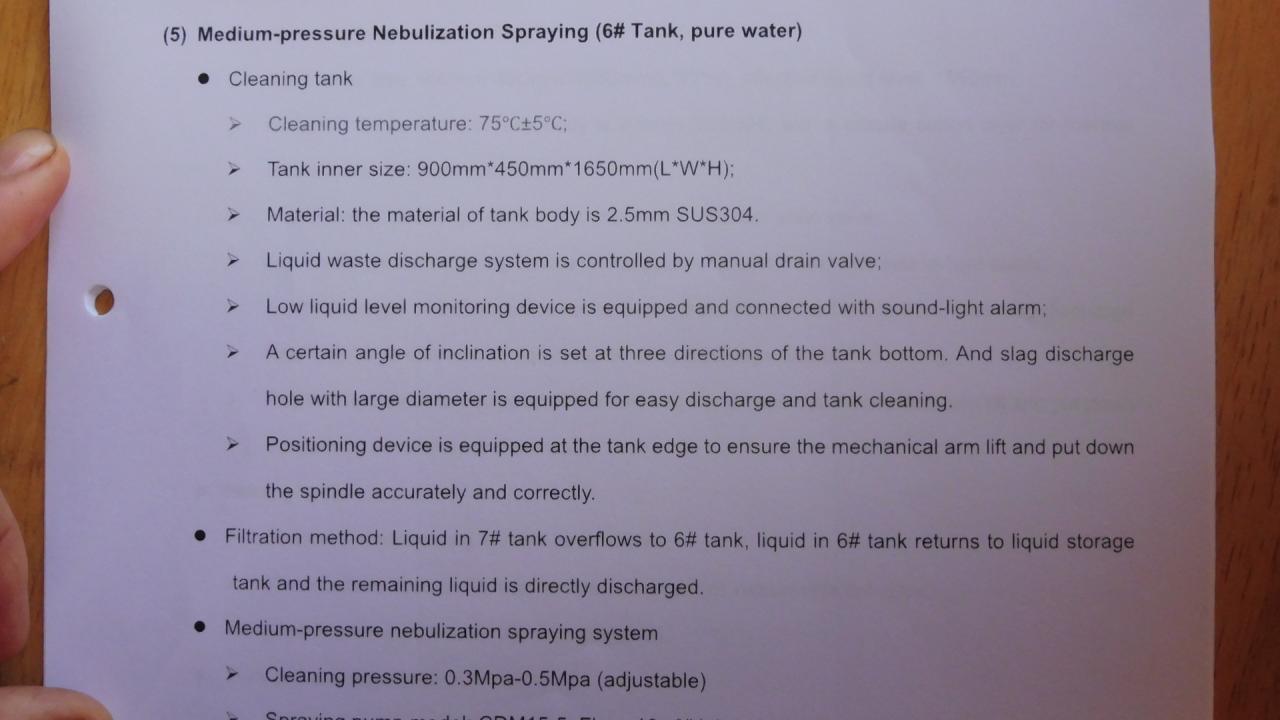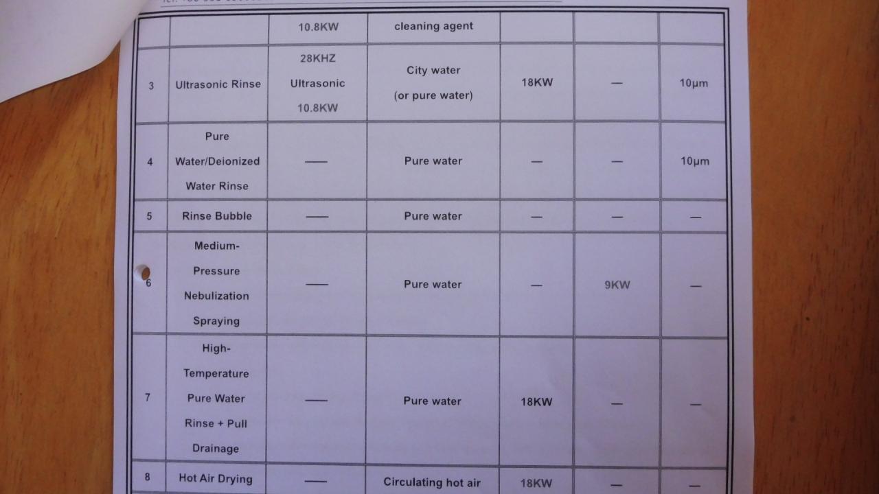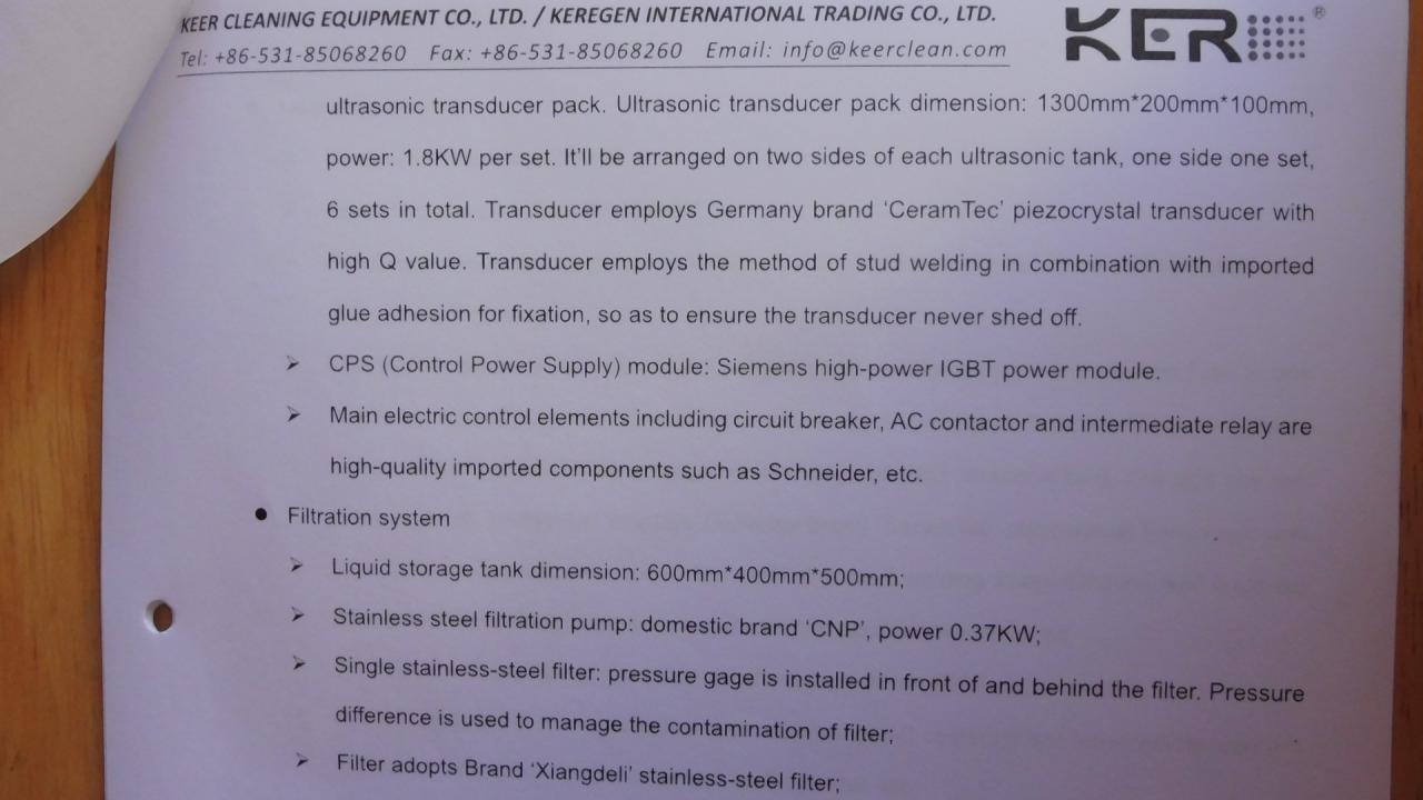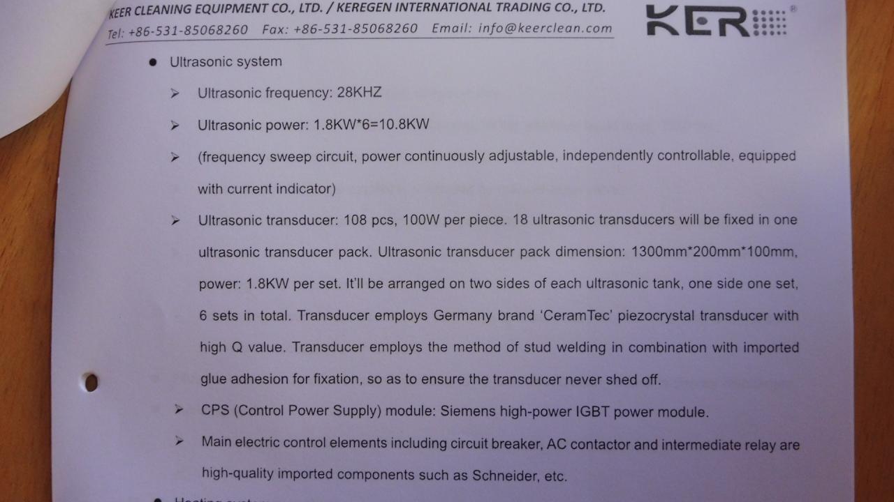 Ultrasonic System - Ultrasonic frequency 28KHZ; Ultrasonic Power 1.8KW*6=10.8KW; Frequency sweep control, power continuously adjustable, independently controllable , equipped with current indicator; Ultrasonic transducer 108 pcs, 100w per piece, 18 ultrasonic transducers will be fixed in a pack.