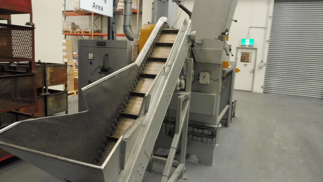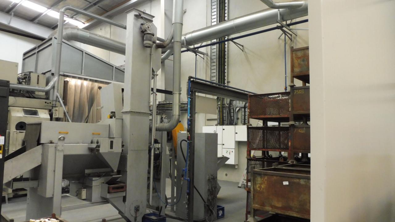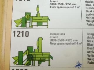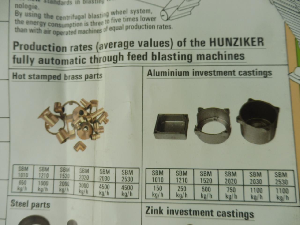 Hunziker Fully Automatic Through Feed Blasting Machine,Type SBM 1210. Complete with infeed product conveyor, 2200mm (l) x 2150mm (h) x 820 mm(w).Steel Belt width-245mm. Main Machine dimensions, 2300mm x 1200mm x 4100mm (h); output shute 700mm wide; control panel 1820mm x 420mm x 980mm (w); includes section of ducting from shot blast to main dust extration ducting.