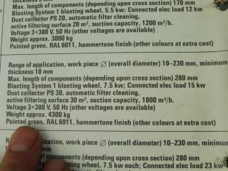 Blasting system 1 blasting wheel, 7.5 kw each, connected electric load 15kw. Voltage-3 x 380v-50hz..weight-4300kg.
