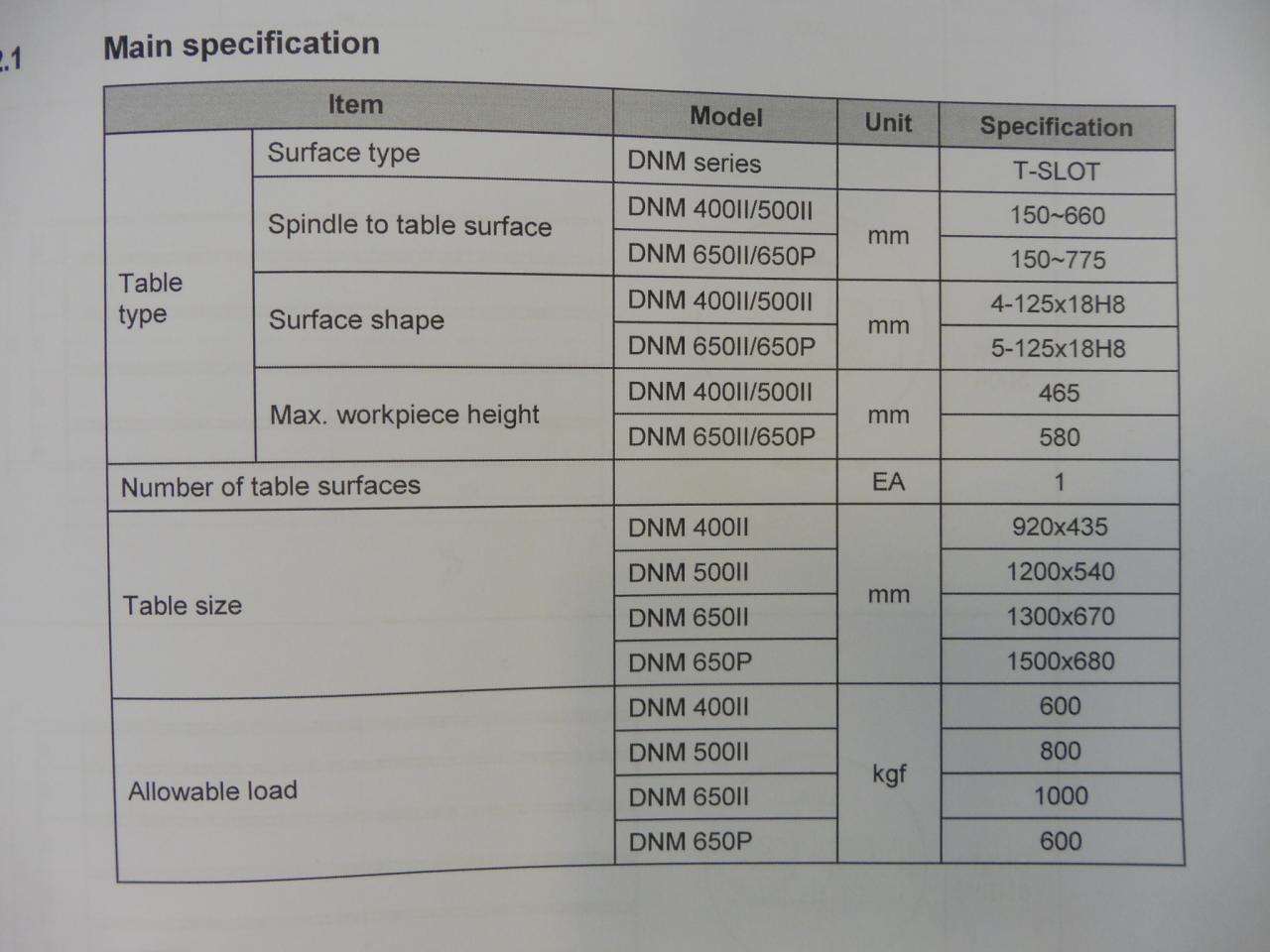 Table Type -"T" slot.. Spindle to table surface-150 to 660mm..Surface Shape-4-125 x 18H8 mm..Max work piece height-465mm..Table Size-1200mm x 540mm..Allowable load-800 kgf.