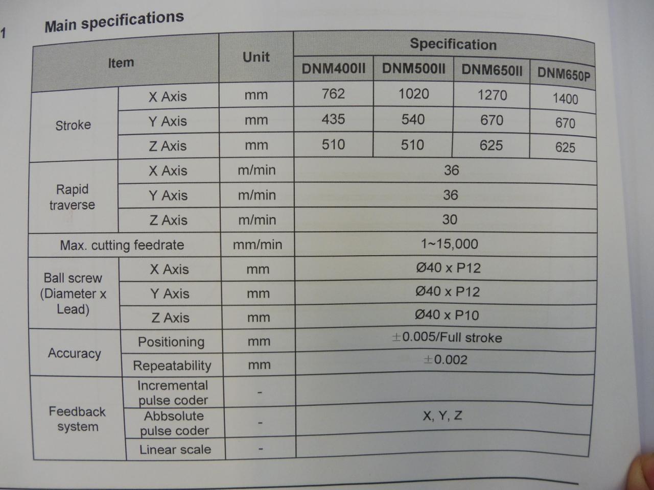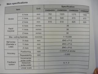 Max cutting feedrate -1-15000 mm/min...Ball Screw (dia x lead) x - dia 40 x p12mm..Y- dia 40 x p12mm..Z- dia 40 x p10mm. Accuracy Positioning +- 0.005/Full Stroke..Repeatability +- 0.002mm.