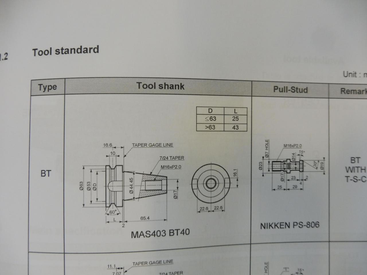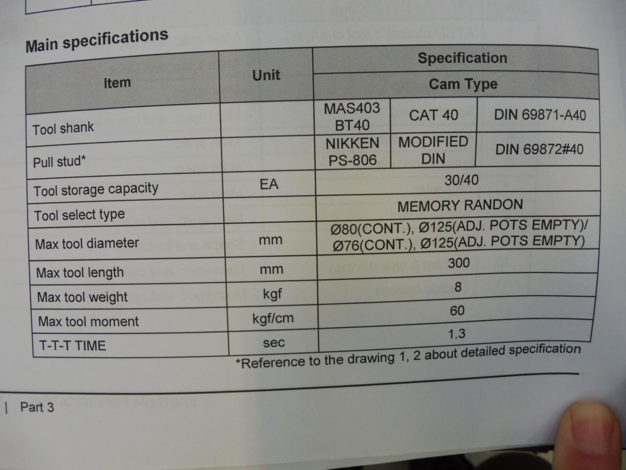 Automatic Tool Changer - Cam Type - ATC..Tool Shank - BT 40..pull stud - Nikken ps806..Tool select type memory random. Max tool dia-80(cont) dia - 76 continuos, dia - 125 adj pots empty..Max Tool Length - 300mm..Max Tool Weight - 8 kgf..T-T-T Time-1.3 sec.