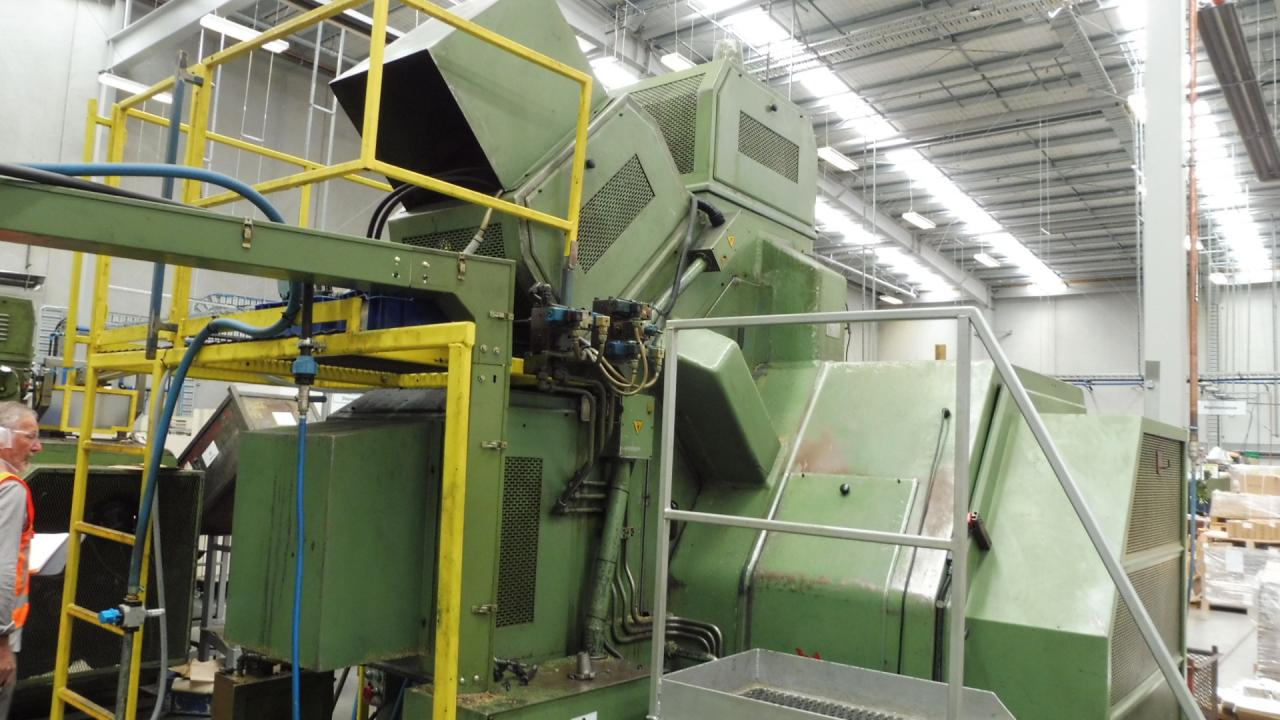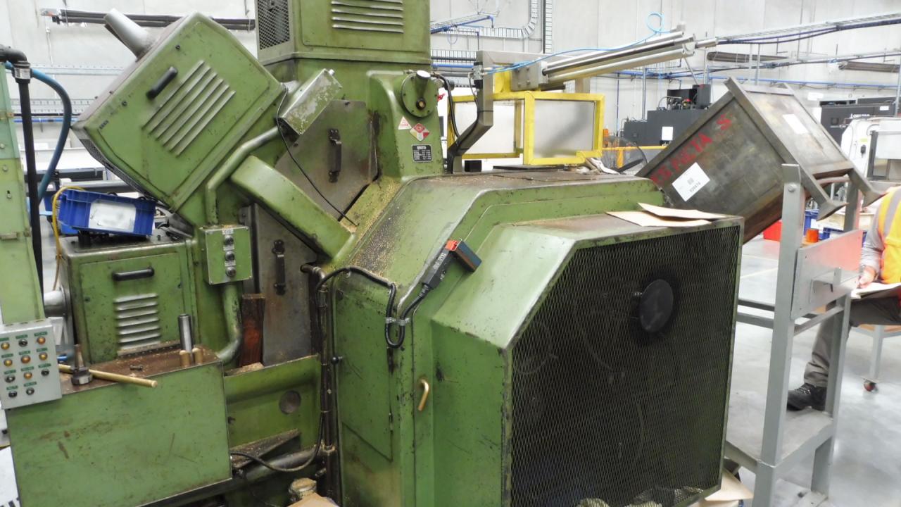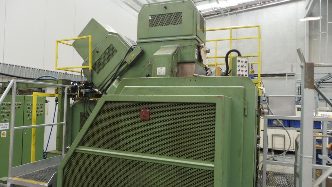 Gnutti Mechanical Machining Centre, automated transfer machine. 3 x vertical heads; this machine has 4 heads on the left; 4 heads on the right; 3 heads on top. One vertical head made for tapping or machining; tapping heads; recessing heads; machining heads. Takes ISO 40 taper tooling.