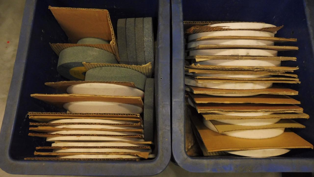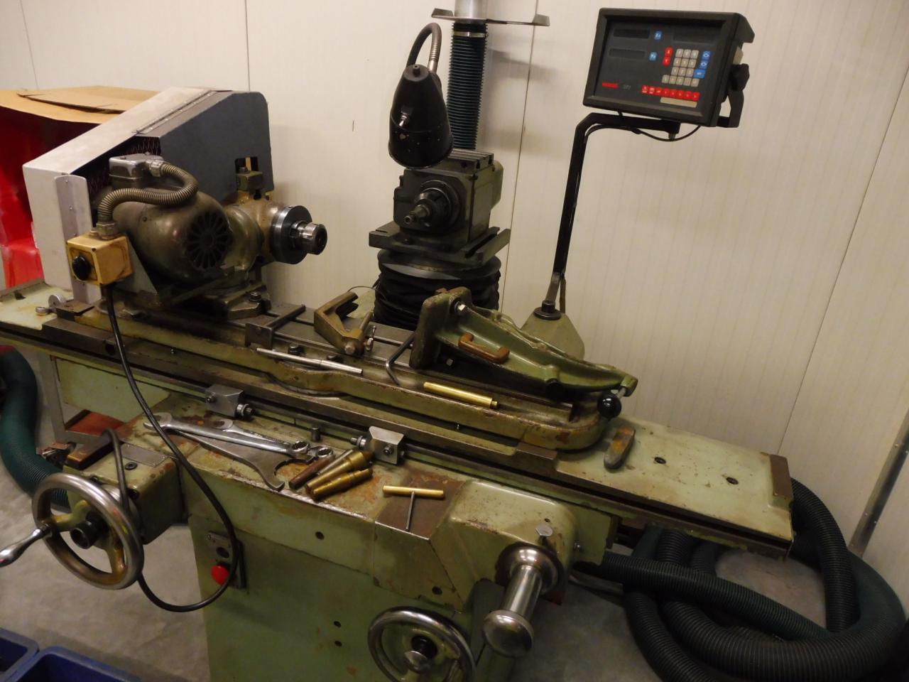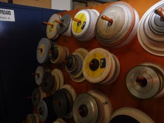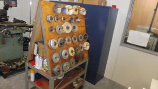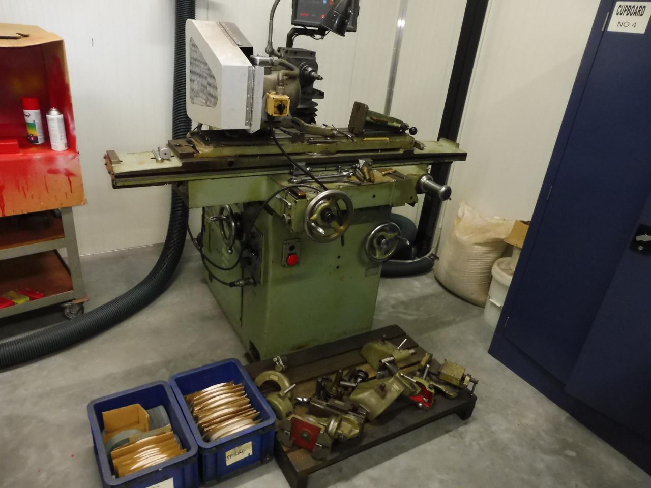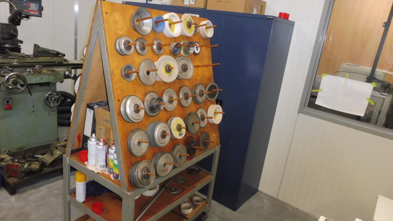 Tool and Cutter Grinder Stankoimport Model 3BS42. Includes trolley rack with a very big assortment of diamond and abrasive grinding wheels.Pallet of machine accessories, 2 x Tote bins of new wheels. Complete with Newall DP7 Digital (XY) Readout.