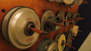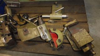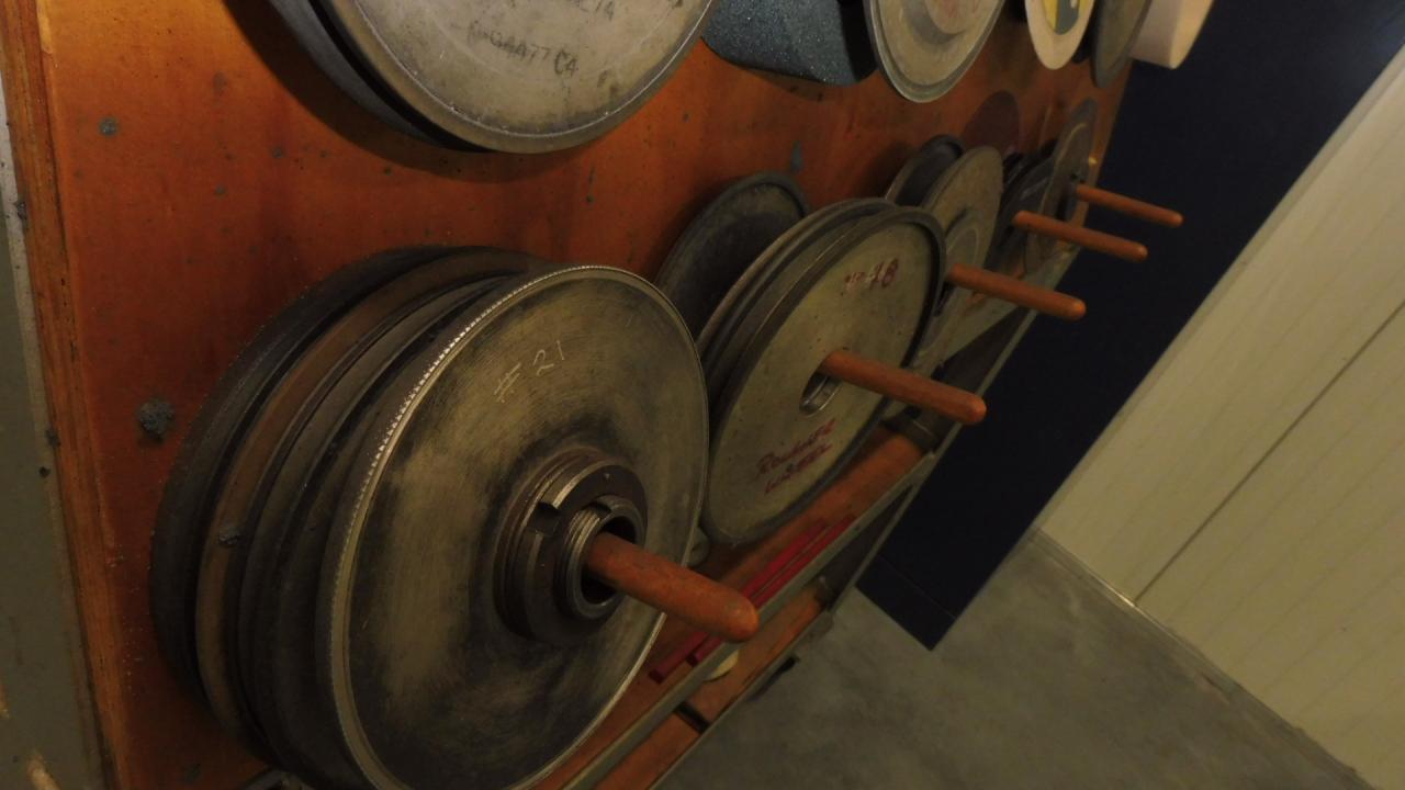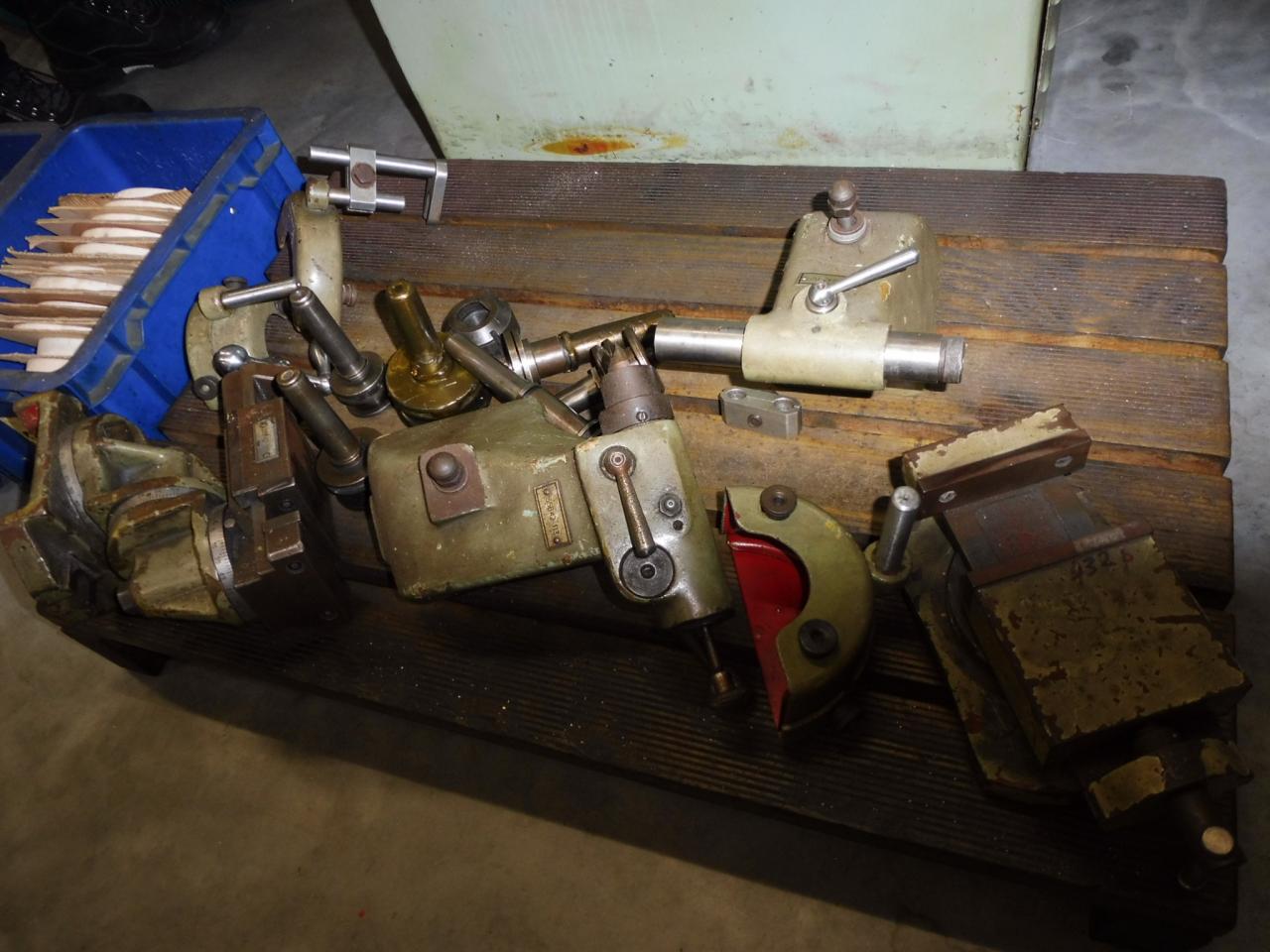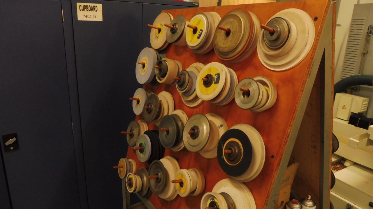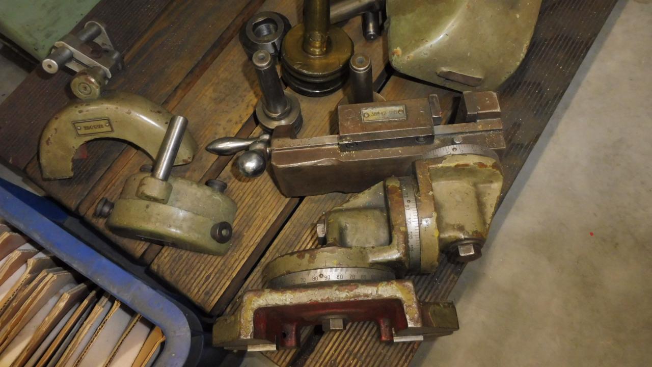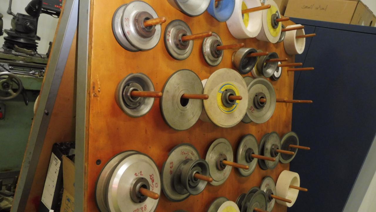 Tool and Cutter Grinder Stankoimport Model 3BS42. Includes trolley rack with a very big assortment of diamond and abrasive grinding wheels.Pallet of machine accessories, 2 x Tote bins of new wheels. Complete with Newall DP7 Digital (XY) Readout.