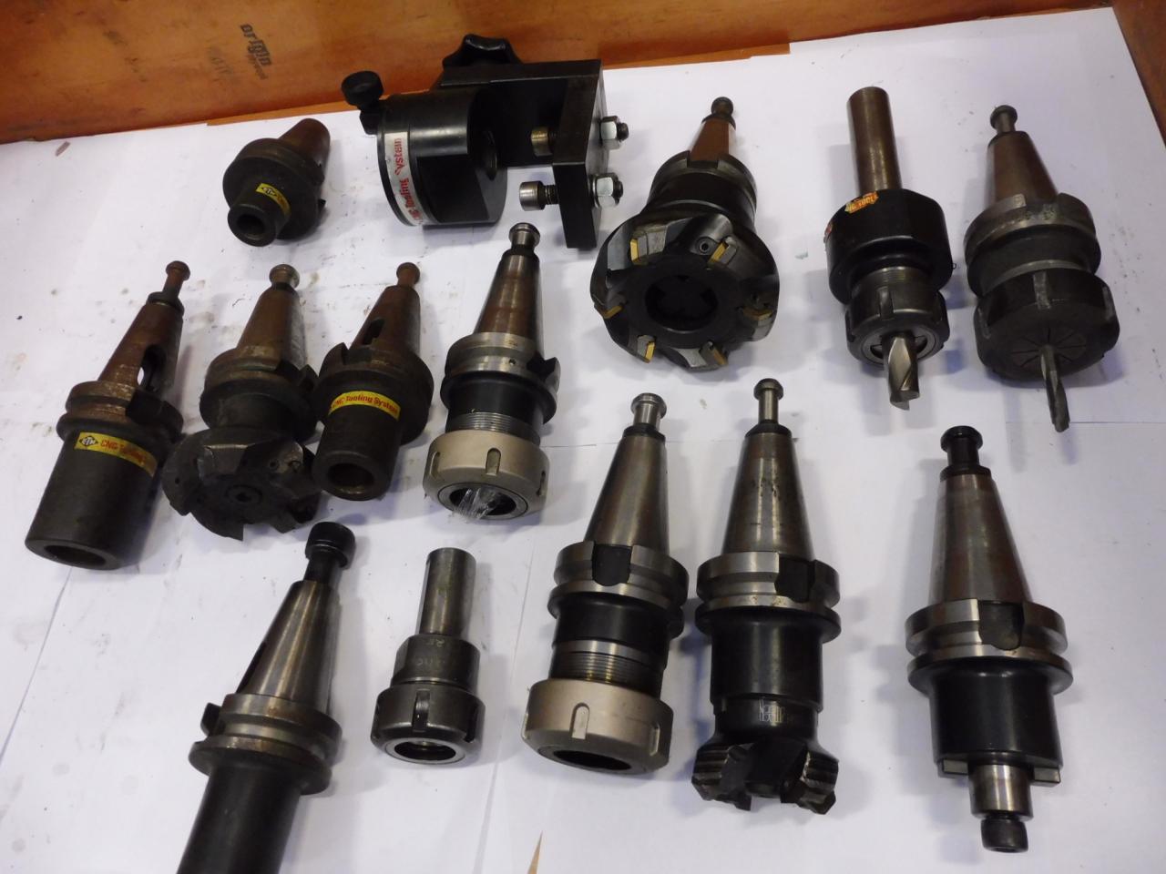 Bin of Assorted Tooling. Facemills , Rotary Tooling Clamp etc.